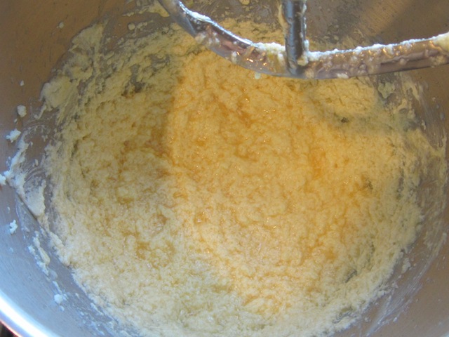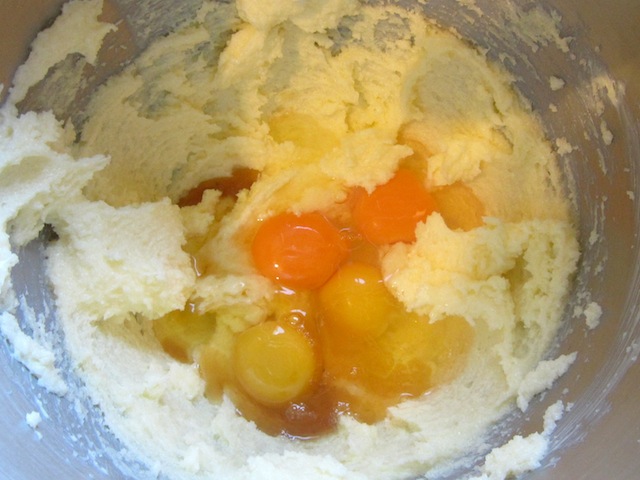 Add in the eggs and egg yolk and vanilla and beat again until blended. Don't forget to scrape down the bowl with a rubber spatula.