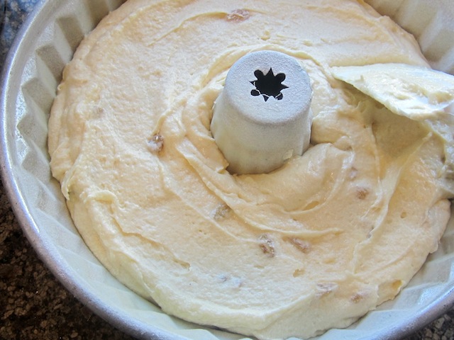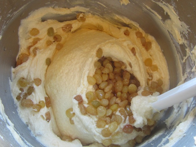 Put the raisins in a small bowl and pour half of the rum for the cake over them. Allow to soak until all the rum is absorbed by the raisins. (This can be done a day ahead to save time on baking day.) Hide the bowl in the refrigerator or passersby will keep pinching raisins out of your rum bowl. Or was that just me? Anyway, better to put them out of sight.