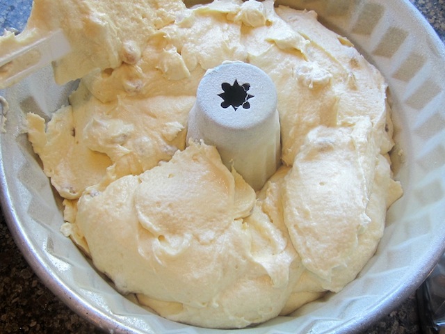 Spoon your batter into your prepared Bundt pan, then smooth out the top with your spatula.
