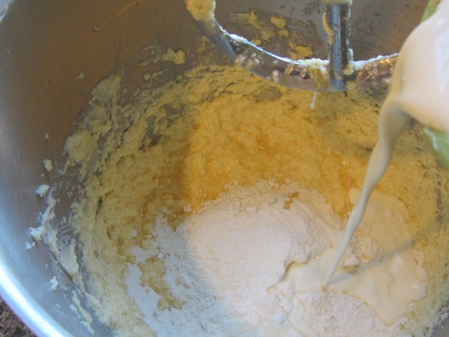 Add about a third of the flour mixture to the batter, along with a third of the cream.