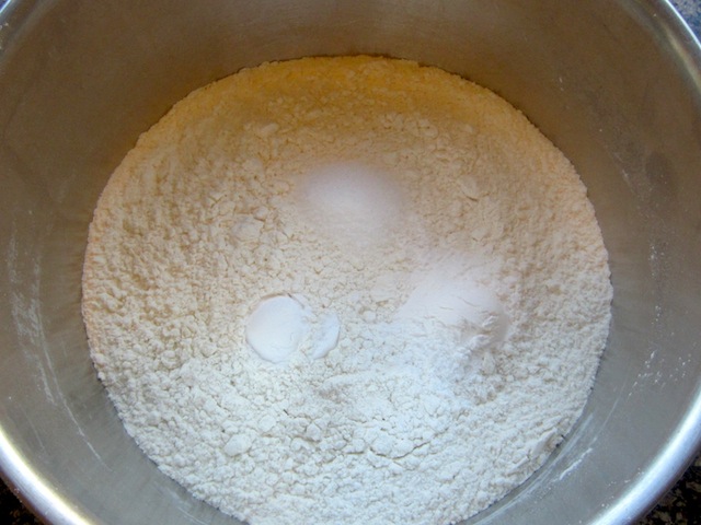 In a medium size bowl, mix together your flour, baking powder, baking soda and salt. Set aside.