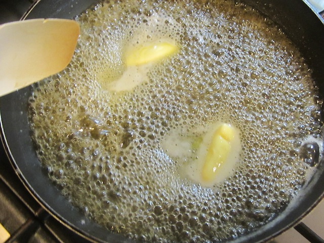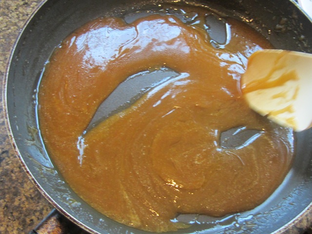 After a minute or so the fumes from the rum should have evaporated and you can turn the heat up a little. We don’t want a fire here, folks. Boil the mixture for three to four minutes, stirring constantly. If you have a candy thermometer, you are looking to reach a temperature 240-248°F or 115-120°C. If you don’t have a candy thermometer, not to worry.