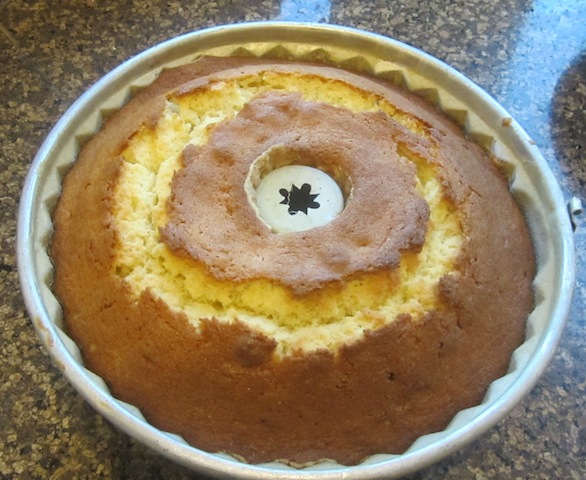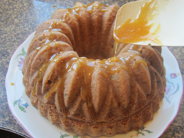 Use a spoon to ladle the glaze over your completely cooled cake. Do not poke it with your fingertips because you will leave print marks behind in the shiny, shiny glaze.