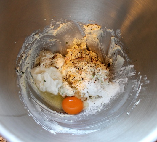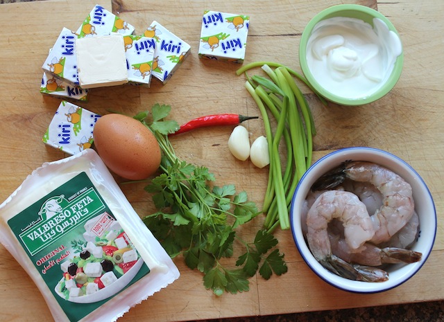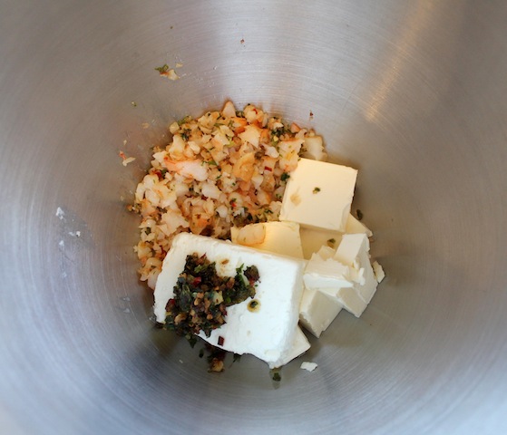 In a big mixing bowl, mix your cream cheese, feta and chopped shrimp, adding in the cooked herbs and garlic from the saucepan.