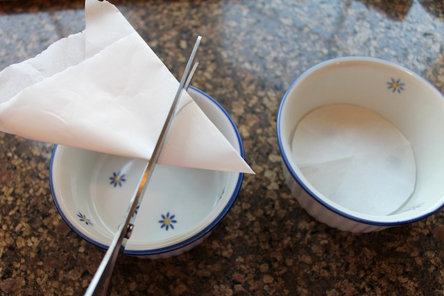 Preheat your oven to 325°F or 165°C and prepare your pans or ramekins by cutting out circles of parchment paper for the bottoms and spraying the insides with non-stick spray. (My two ramekins each held 3/4 cup or almost 180ml quite comfortably without danger of spillage. Test your volume with a measuring cup and water before preparing your ramekins.)