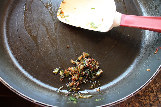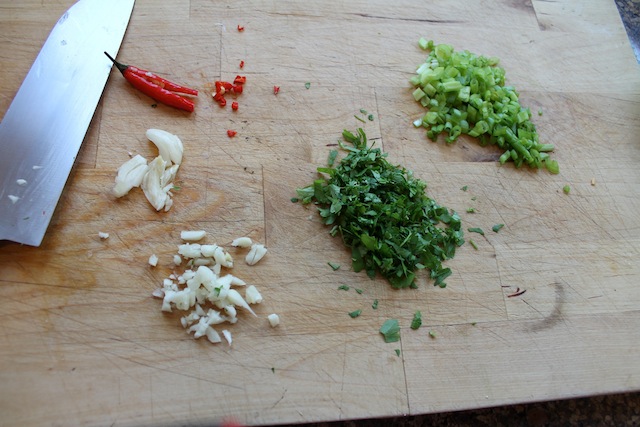 Set aside just a tiny bit of the parsley, chili pepper and green onions for garnish later.