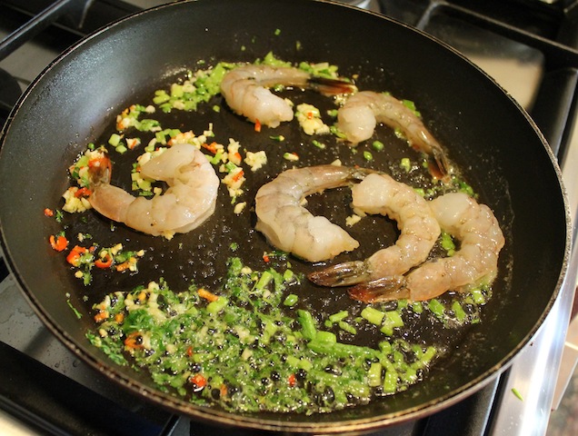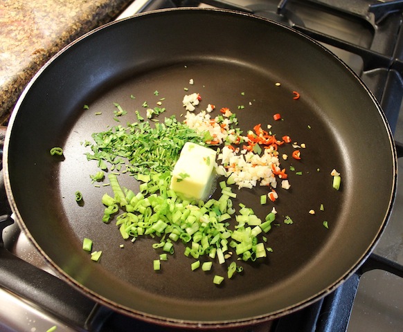 Put the rest of the parsley, chili pepper, green onion and all of the garlic in a saucepan with the butter and shrimp. Cook until the shrimp are completely done.