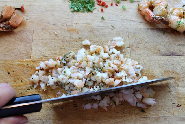 Remove the shrimp from the pan and take the tails off of four of them. Chop the four shrimp with a large knife. Wrap the two remaining shrimp and refrigerate. These will be garnish later.