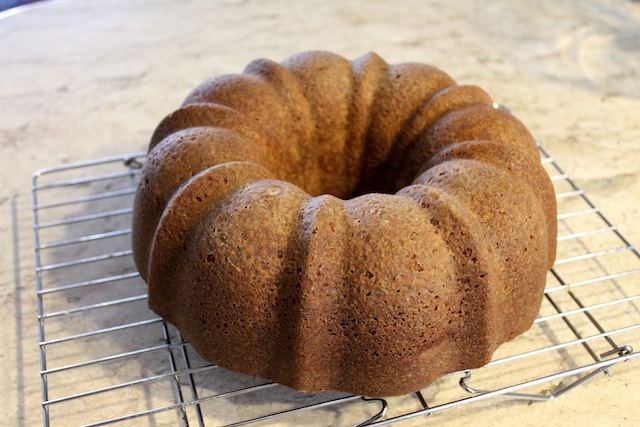 To remove it, place a wire rack upside down on the cake and invert the cake pan to release the cake.  Allow to cool completely before adding the glaze.