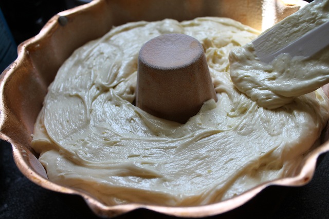 Preheat your oven to 350°F or 180°C and prepare your Bundt pan by spraying liberally with non-stick spray and then coating with a little flour.