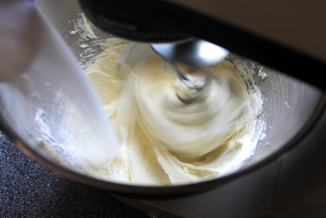 Add the sugar, either a third at a time, beating well after each addition, or in a slow continuous stream as you are beating.