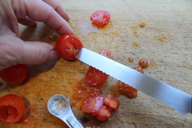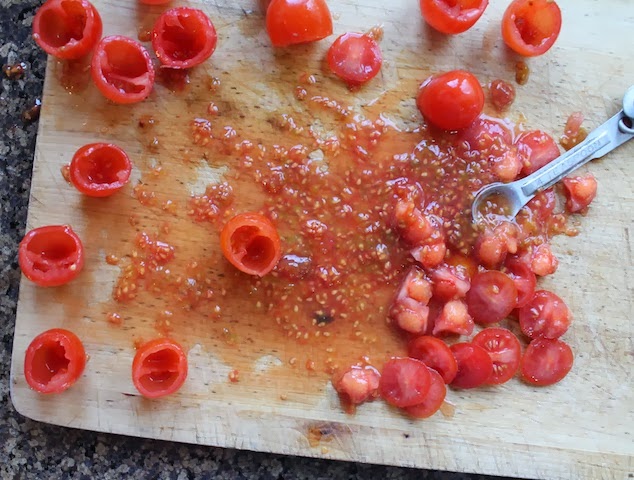 Cut the tops off of your cherry tomatoes and run the knife around the inside to loosen the flesh.