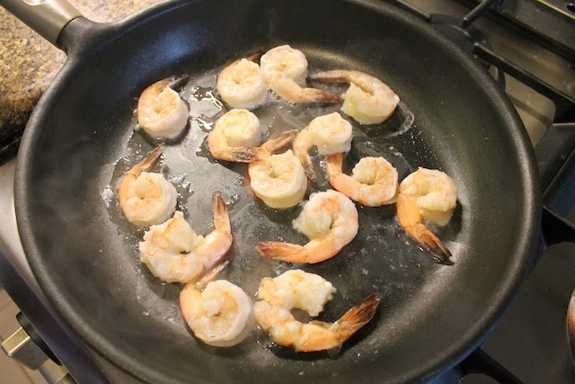 Gently sauté the shrimp in a drizzle of olive oil until just cooked.  Set aside to cool.  I cooked them with the tails still on then took them off.  It doesn't make a difference so you can just as easily take the tails off first.