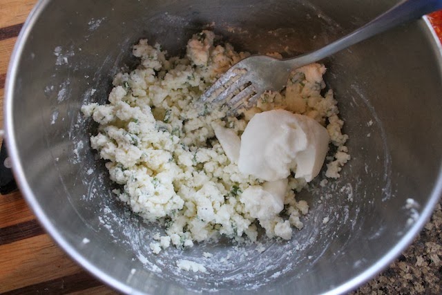 Crumble your feta cheese in a small bowl, add in the yogurt, the minced green onion and a few generous grinds of fresh black pepper.  Mix thoroughly.