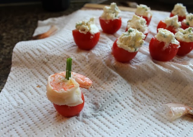 Put one shrimp on top of each filled tomato.  Press gently to stick the shrimp down.