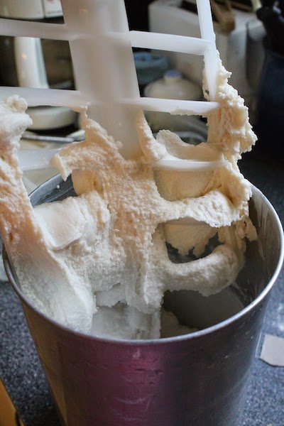 Pour the base into an ice cream maker and freeze according to the manufacturer’s instructions. Mine’s the old-fashioned kind that requires ice and rock salt and churns with a big paddle.
