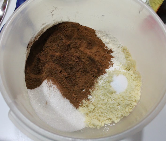 Combine your flour, ground almonds, sugar, cocoa powder, baking powder and salt in a large mixing bowl.