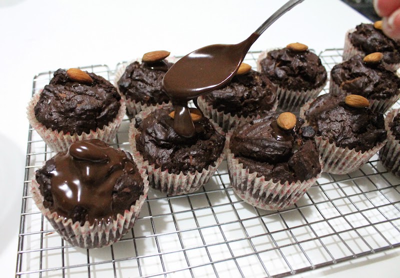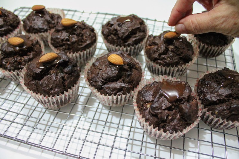 Allow to set a little then spoon on more ganache to cover the almond and the cupcake.