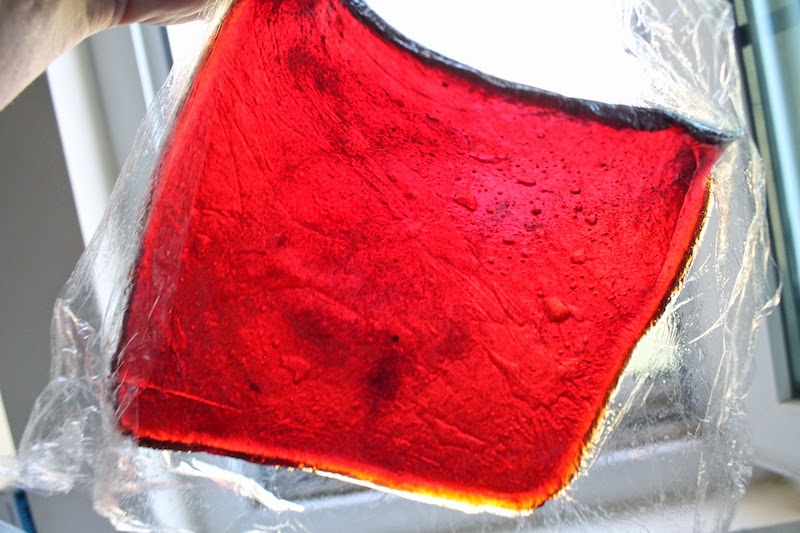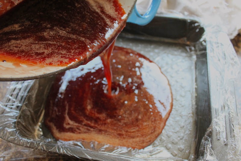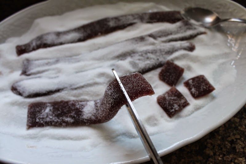 This recipe is based on one from the current Jamie magazine (Issue 54, December 2014) but can also be found online here. I didn't want actual bits of fruit in mine so I changed up the method. If you want bits of apple and pear in yours, do not add the sugar until after the fruit has broken down. I took a quick shot, holding the finish gum, before cutting into squares, up to the light and look how pretty the color is.