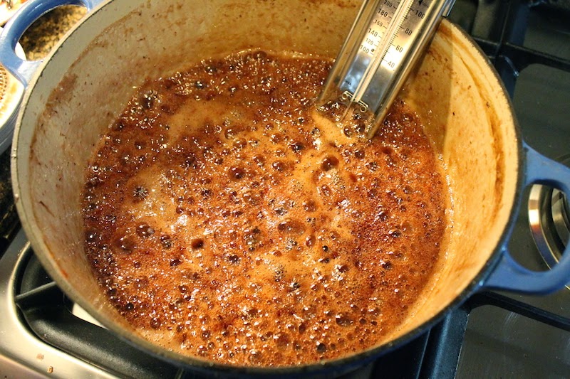 Boil over a medium heat until a candy thermometer reaches 240°F or 115°C or test for doneness by dropping a scant 1/2 teaspoon slowly into a glass of cold water. The syrup should form a ball as it hits the water. If it doesn’t, give it a few more minutes on the stove and try again with a fresh glass of cold water.