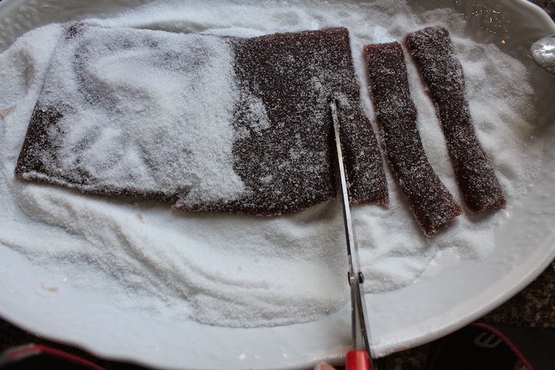 When you are ready to cut the squares apart, put your white sugar in a platter or pan with sides and tip the gum square into the sugar.