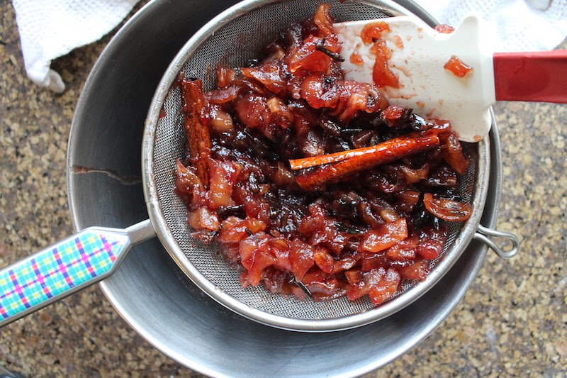 Strain the solids out of the pot with a heavy, heatproof sieve. Allow to drain completely, using a spoon or spatula to squeeze all the thick syrupy juice out.