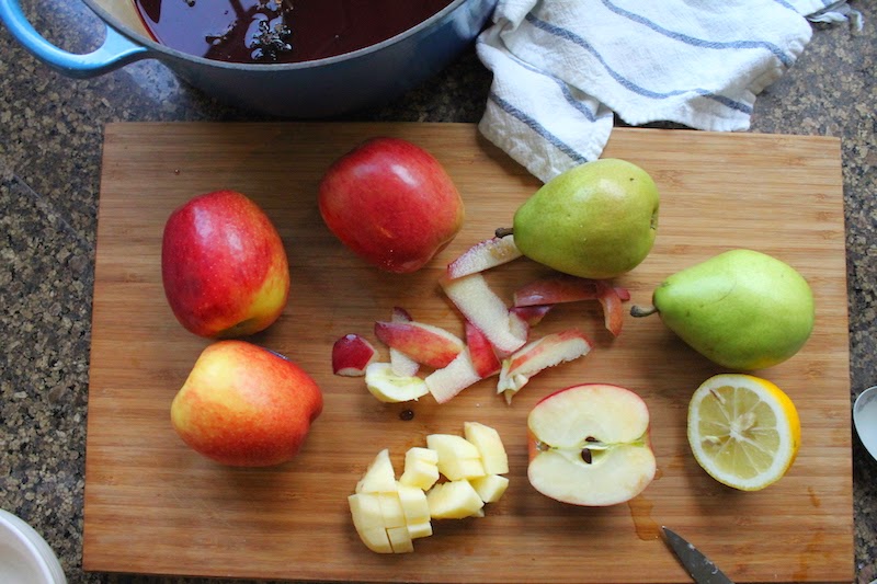 Measure your wine, orange juice and half the lemon juice into a heavy bottomed pot, along with the spices. Peel, core and roughly chop your apples and pears and put them directly into the wine pot.