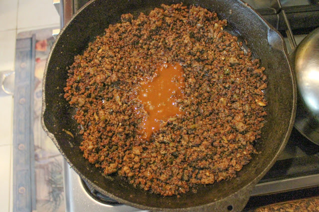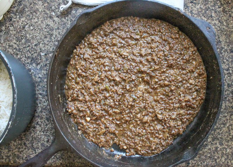 Lower the fire and simmer for a couple of hours, adding water occasionally when the mixture gets a little too dry. You want to end up with a thick meat-filled gravy.