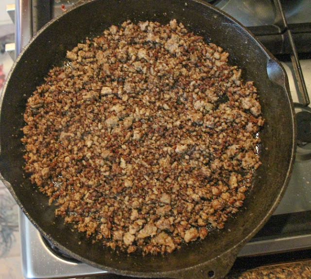 Cook over a medium heat, stirring occasionally, breaking the meat into small pieces with your spoon as it cooks.
