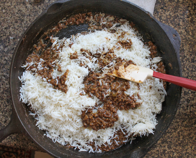 Gently fluff your rice with a fork to separate the grains and then mix the rice in with the meat.