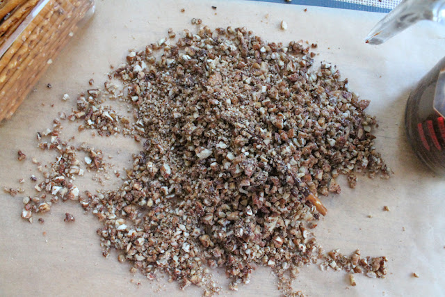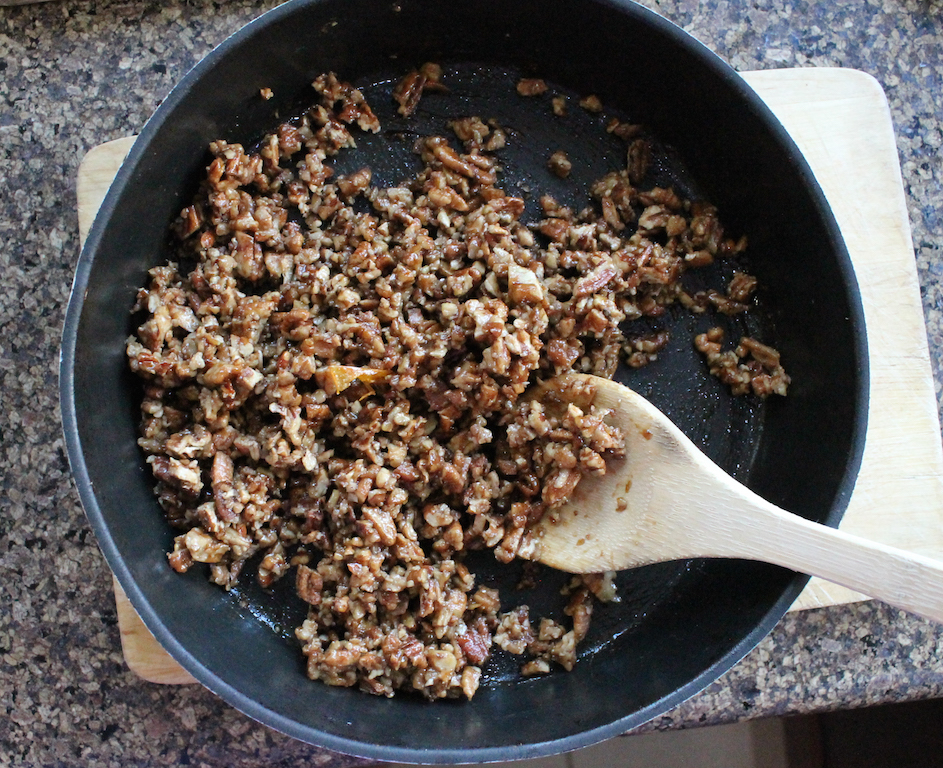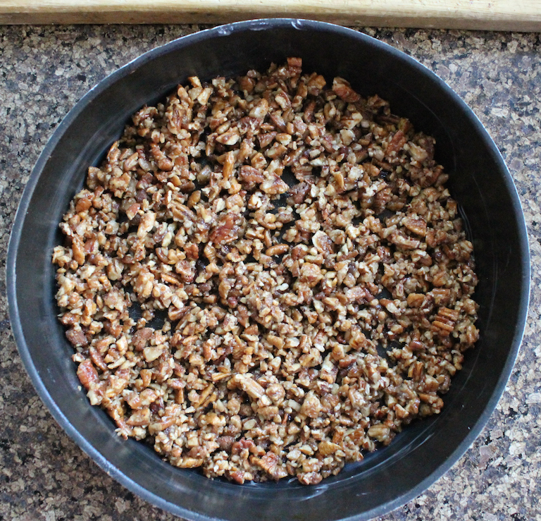 Stir together your chopped pecans, brown sugar, salt and cream. Spread the mixture out evenly in the pan.