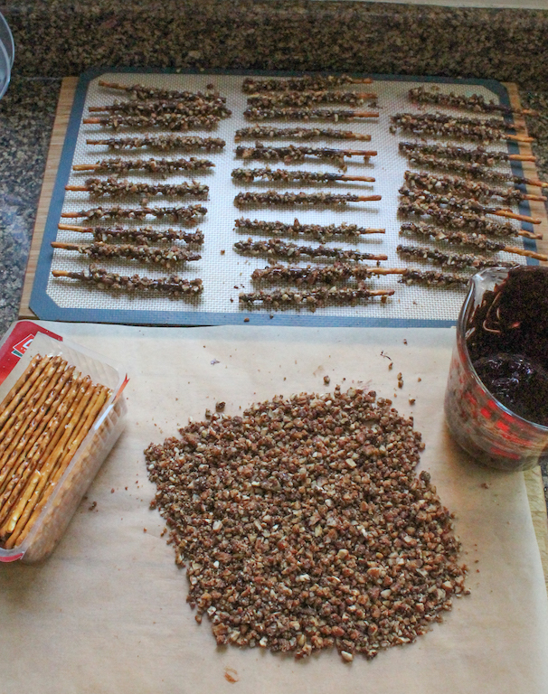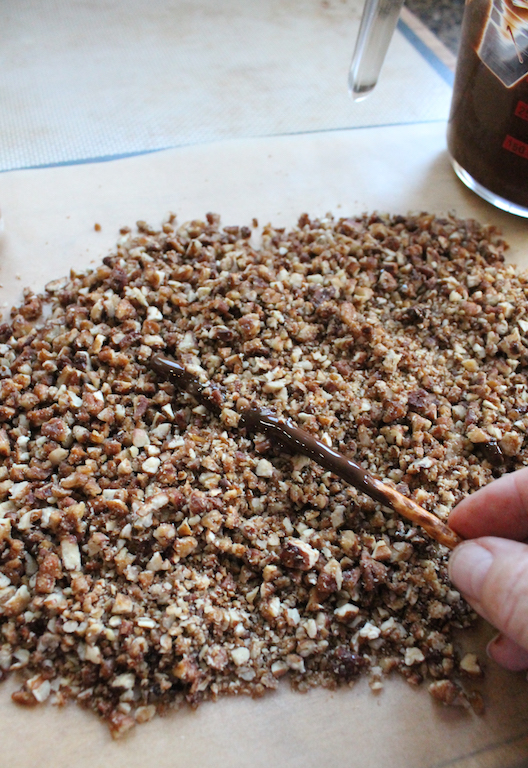 Continue until you run out of praline bits or chocolate or pretzels. I ran out of praline bits first this time, and made more than 5 dozen chocolate praline pretzels.