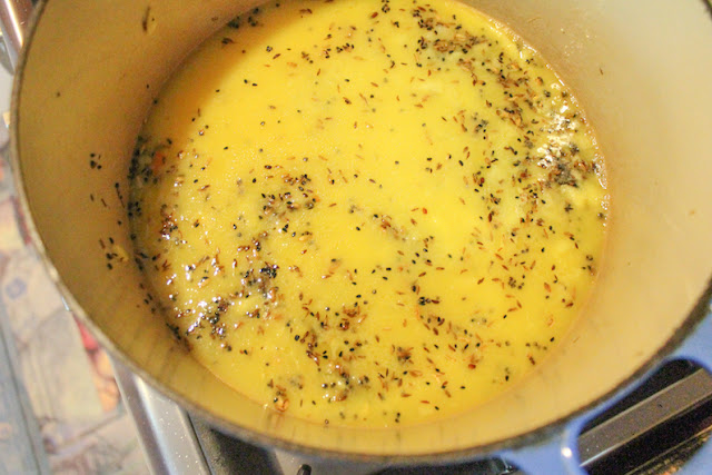 In a large pot, heat the oil and add the mustard seeds. When they start to pop, add in the other spices and give the whole thing a quick stir.