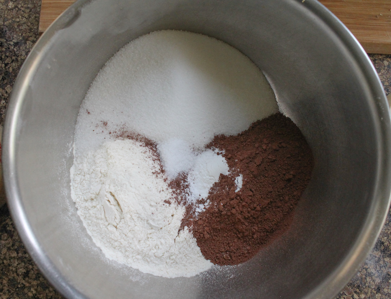 In a large mixing bowl, whisk together the flour, sugar, cocoa powder, baking powder and salt.